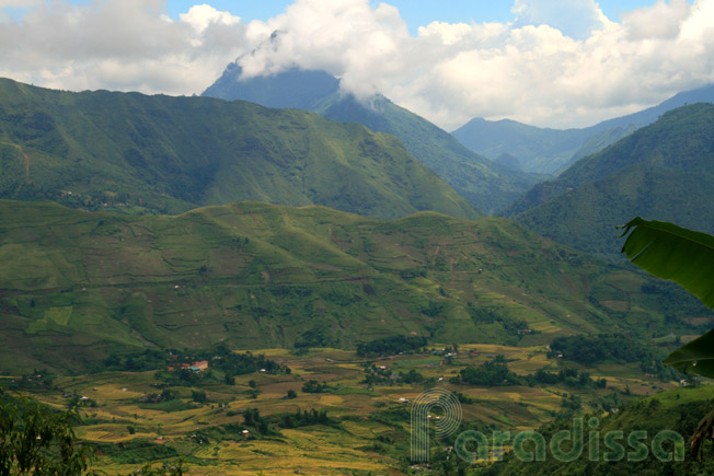View of golden rice terraces on the trek to Bach Moc Luong Tu